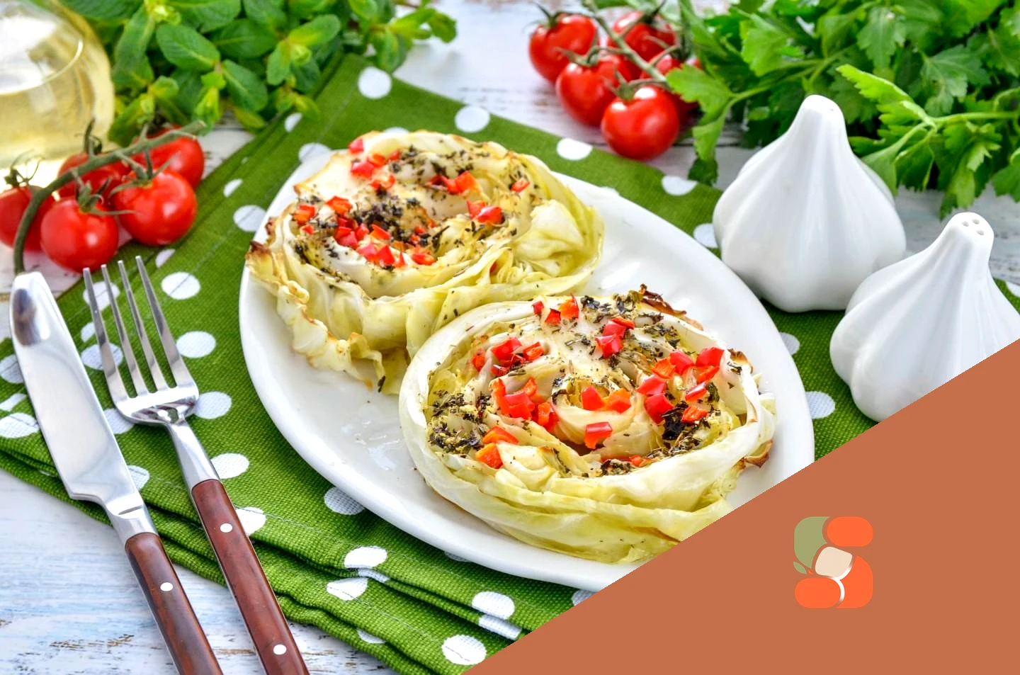 : Капустяні стейки викладіть у відповідну форму для запікання так, щоб вони не знаходили один на одного. Змастіть верх капусти соусом, що вийшов, потім посипте нарізаним перцем. Про вибір потрібної форми читайте у статті за посиланням наприкінці рецепту.