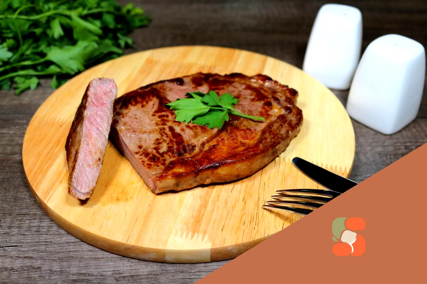 : Коли стейк буде доведений до потрібної прожарки, перекладіть його на теплу тарілку, яку накрийте фольгою. Це робиться для того, щоб м'ясний сік поступово розподілився по волокнах м'яса. Якщо ж відразу після обсмажування розрізати стейк, весь сік витіче на тарілку. Тому дайте м'ясу «відпочити» кілька хвилин, але не менше двох, після чого додайте сіль та чорний перець до смаку. Приємного апетиту!