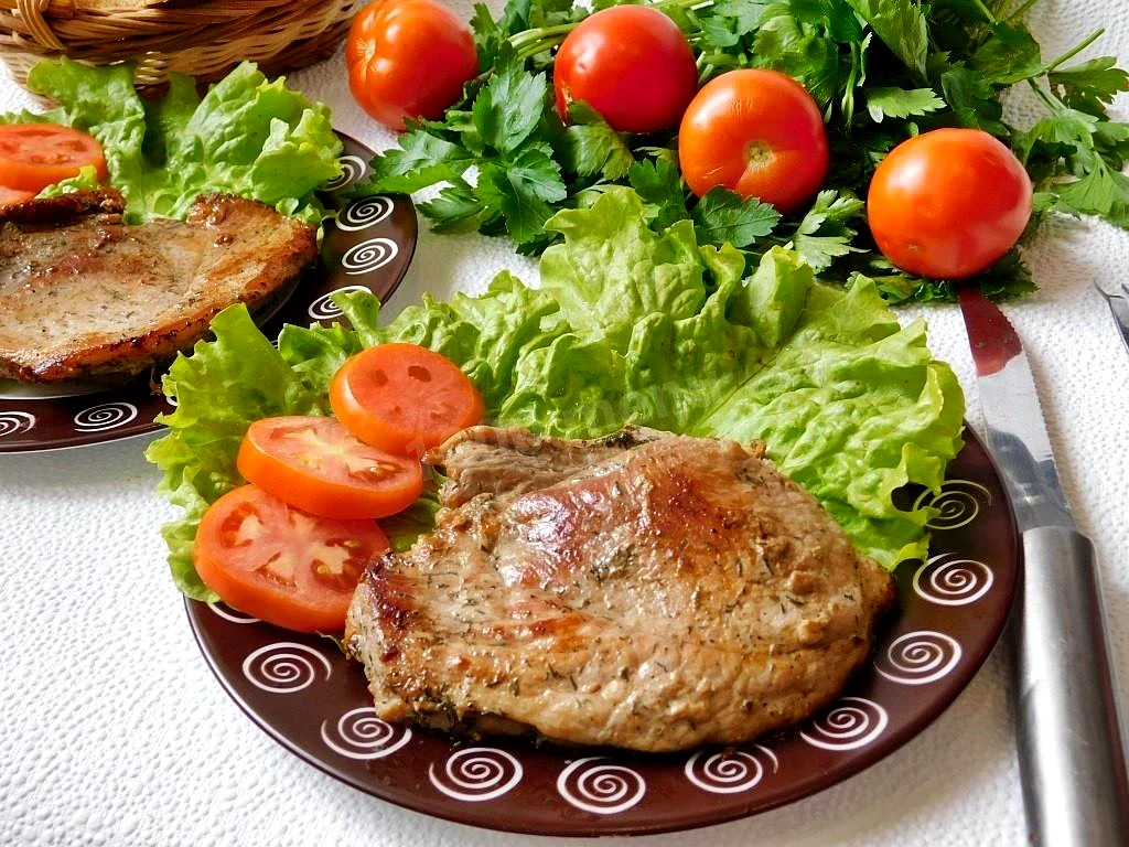 : Свежее мясо свинины нарежьте на порционные стейки. Толщиной они должны быть не менее 2-2,5 см. Толще делать не надо, так как мясо может не прожариться достаточно хорошо.