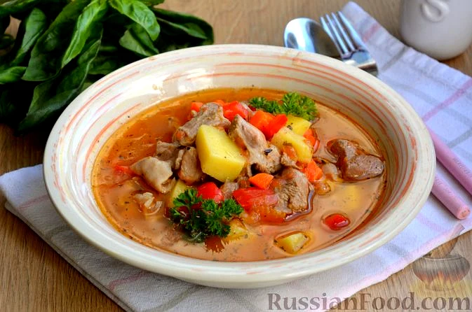 # Суп-гуляш з індичкою Ароматна, густа страва з ніжним м'ясом індички, яка розтане в роті, та барвистими овочами — справжній угорський гуляш у вигляді супу. Золотаво-коричневий бульйон з насиченим см…