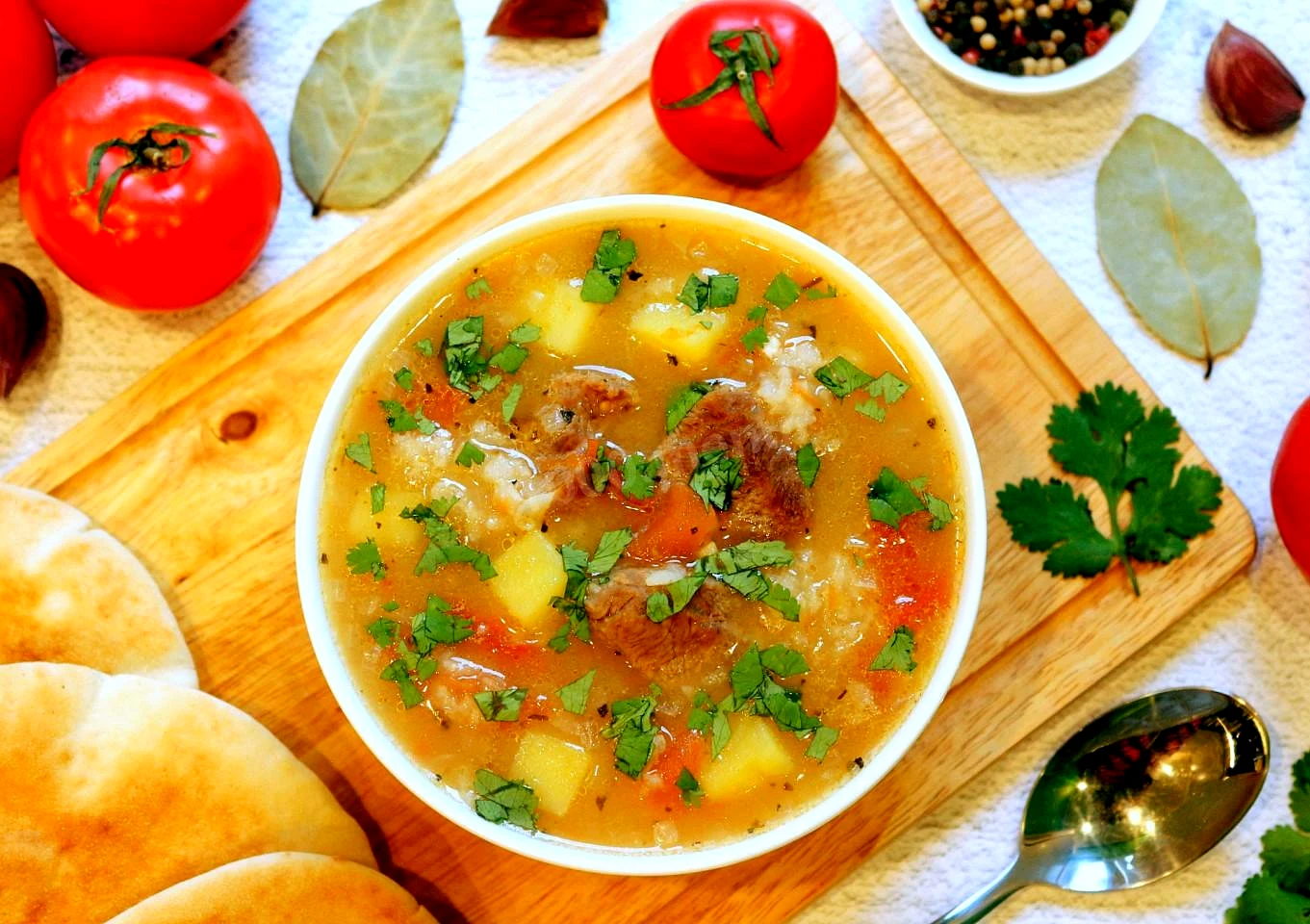 : Коли яловичина звариться і стане м'якою, додайте в каструлю рис, картопля і кубики помідорів, що залишилися. Продовжуйте варити суп до готовності картоплі рису приблизно 15-20 хвилин.