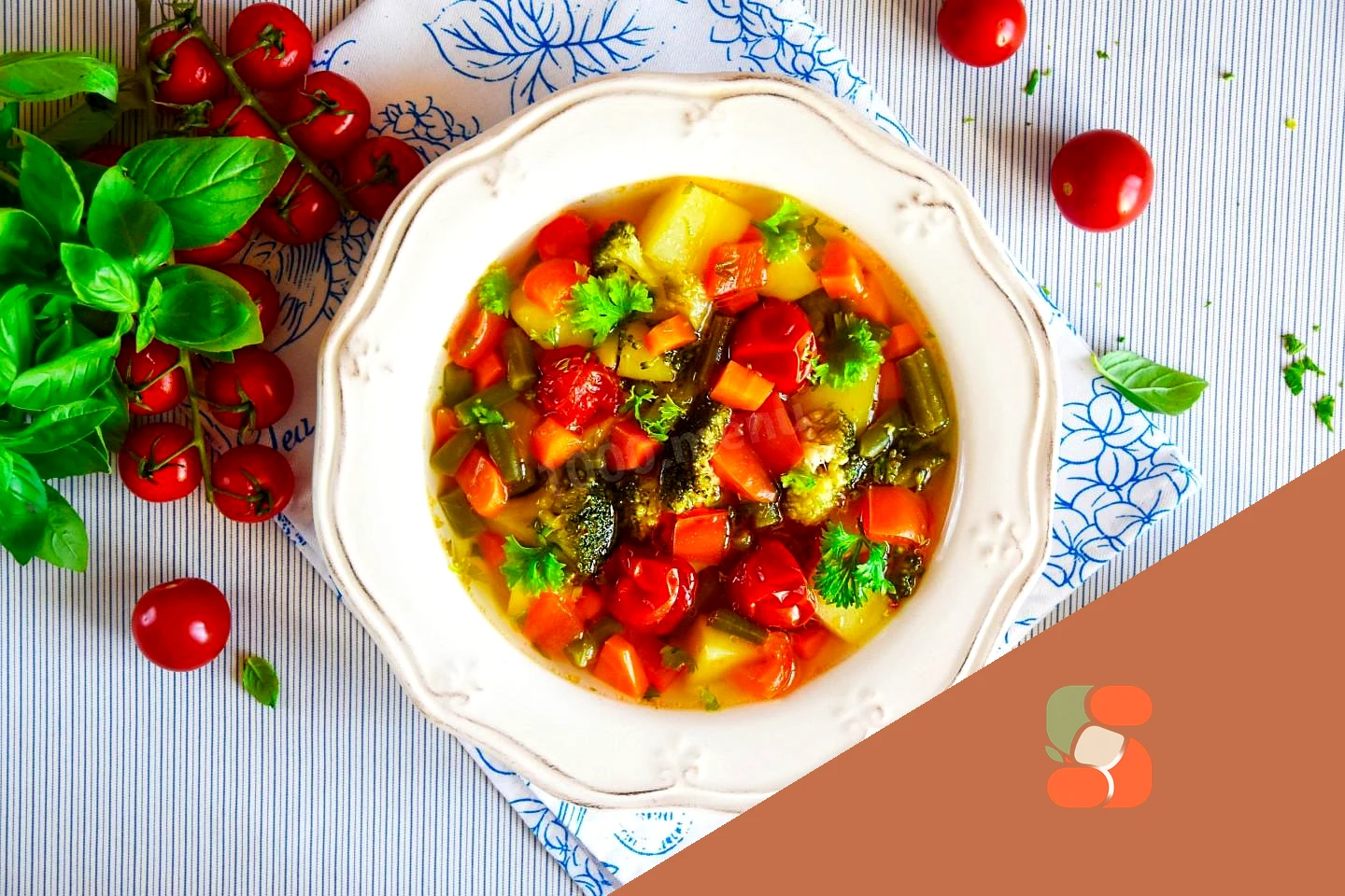 : Як зварити смачний овочевий суп на м'ясному бульйоні? Дуже просто і досить легко. Спочатку підготуйте необхідні інгредієнти за списком. У мене був готовий бульйон зі свинячих ребер, зварений заздалегідь. Овочі можна замінювати або доповнювати на свій смак. Наприклад, додати зелений горошок, кабачки, баклажани, броколі замінити кольоровою або білокачанною капустою.
