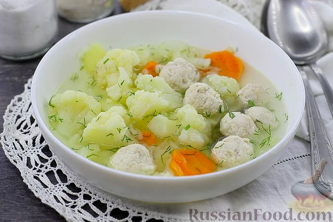 # Суп із фрикадельками та квітковою капустою Ніжний та мясний суп, який квасолить любого члена сімї! Ароматні фрикадельки та білосніжні суцвіття капусти плавають у золотистому бульйоні, створюючи…