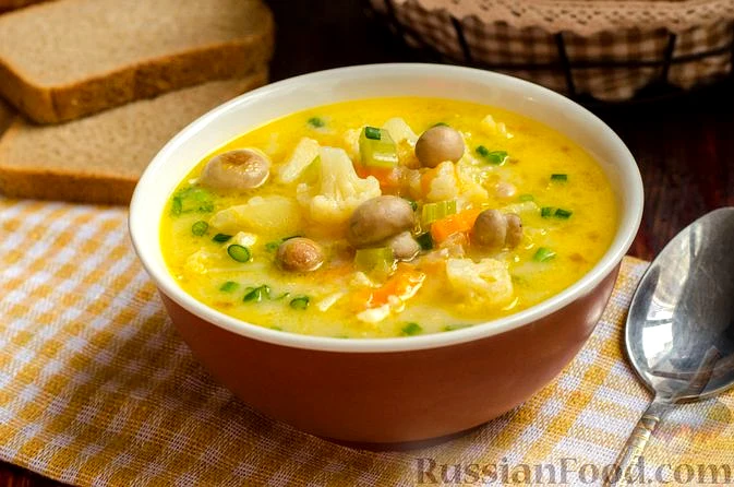 Суп з цвітною капустою, печерицями та плавленим сиром