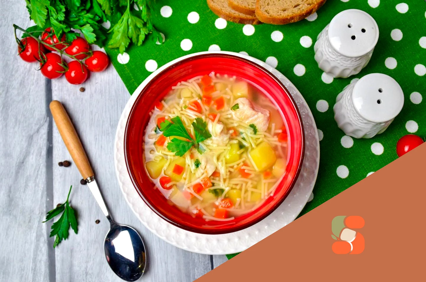 : Проваріть суп до готовності овочів, близько 15 хвилин Перевіряйте картоплею - вона повинна легко розламатися при натисканні ложкою. Закиньте вермишель і зелень, перемішайте. Варіть ще близько 3-5 хвилин (залежно від сорту вермішелі). Потім нагрівання вимкніть, накрийте кришкою каструлю і залиште суп постояти так хвилин 15, щоб вермішель остаточно доготувалася.