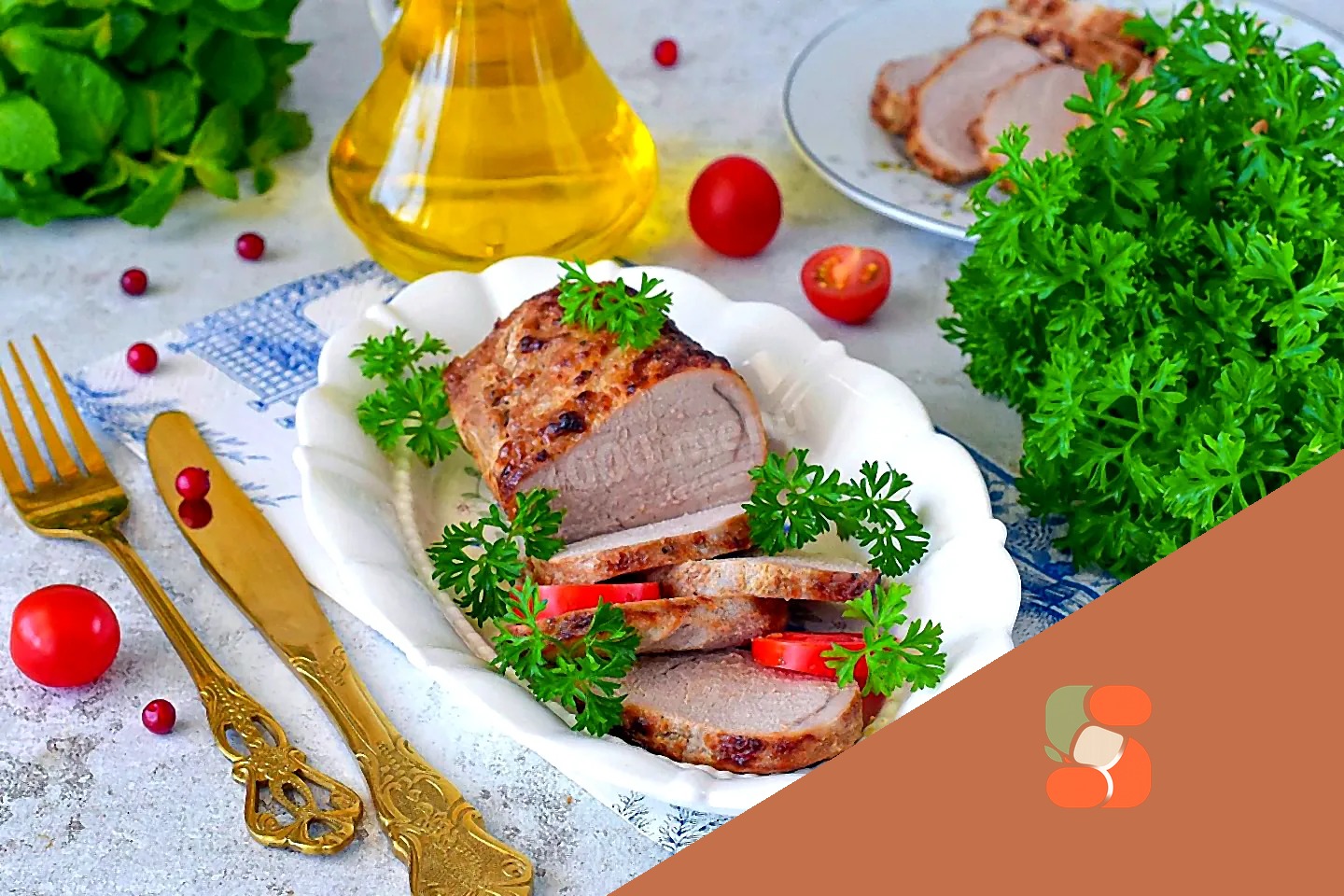 Як красиво подати і нарізати варене м'ясо? Свинячу вирізку, запечену в аерофритюрниці, наріжте скибочками, прикрасьте свіжою зеленню і подавайте до столу. Приємного апетиту!