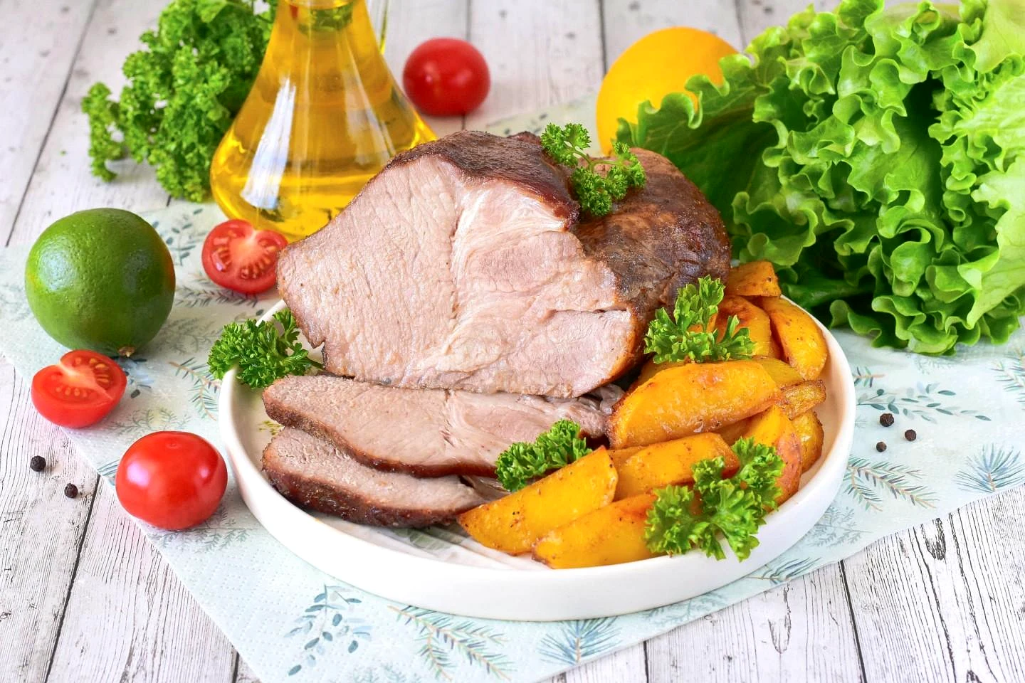 Как подавать запеченную в фольге свиную шею? Запеченную куском в аэрогриле свиную шею переложите на блюдо, нарежьте ломтиками и подайте к столу с любым гарниром, свежими овощами и зеленью, а также в качестве нарезки. Приятного аппетита!