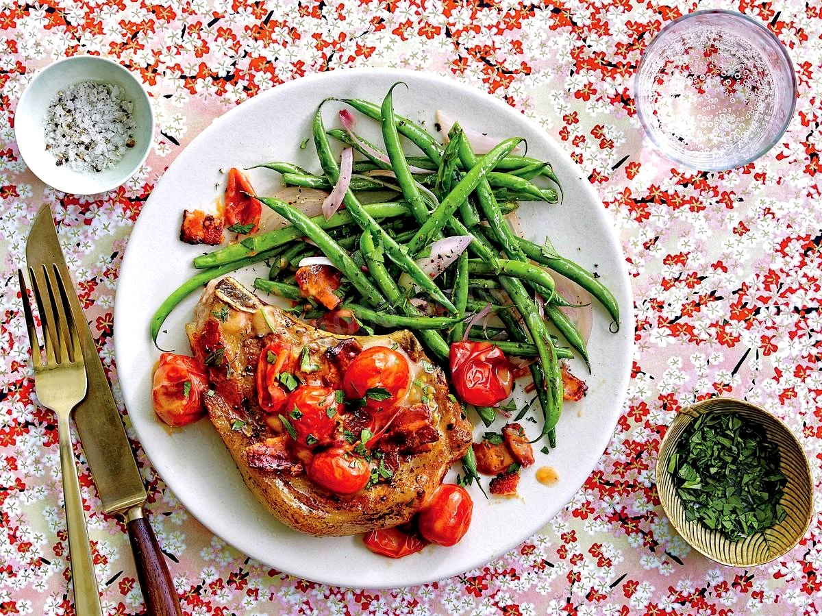 Інгредієнти−4 порції+Продукти (4 порції)Свинина1.2 кгБекон60 грСоль10 грПерец черный молотый2 грЛукшалот - 40 грОливковое масло20 млПомидоры черри500 грПшеничная мука30 грМясной бульон250 млПетрушка20 гр