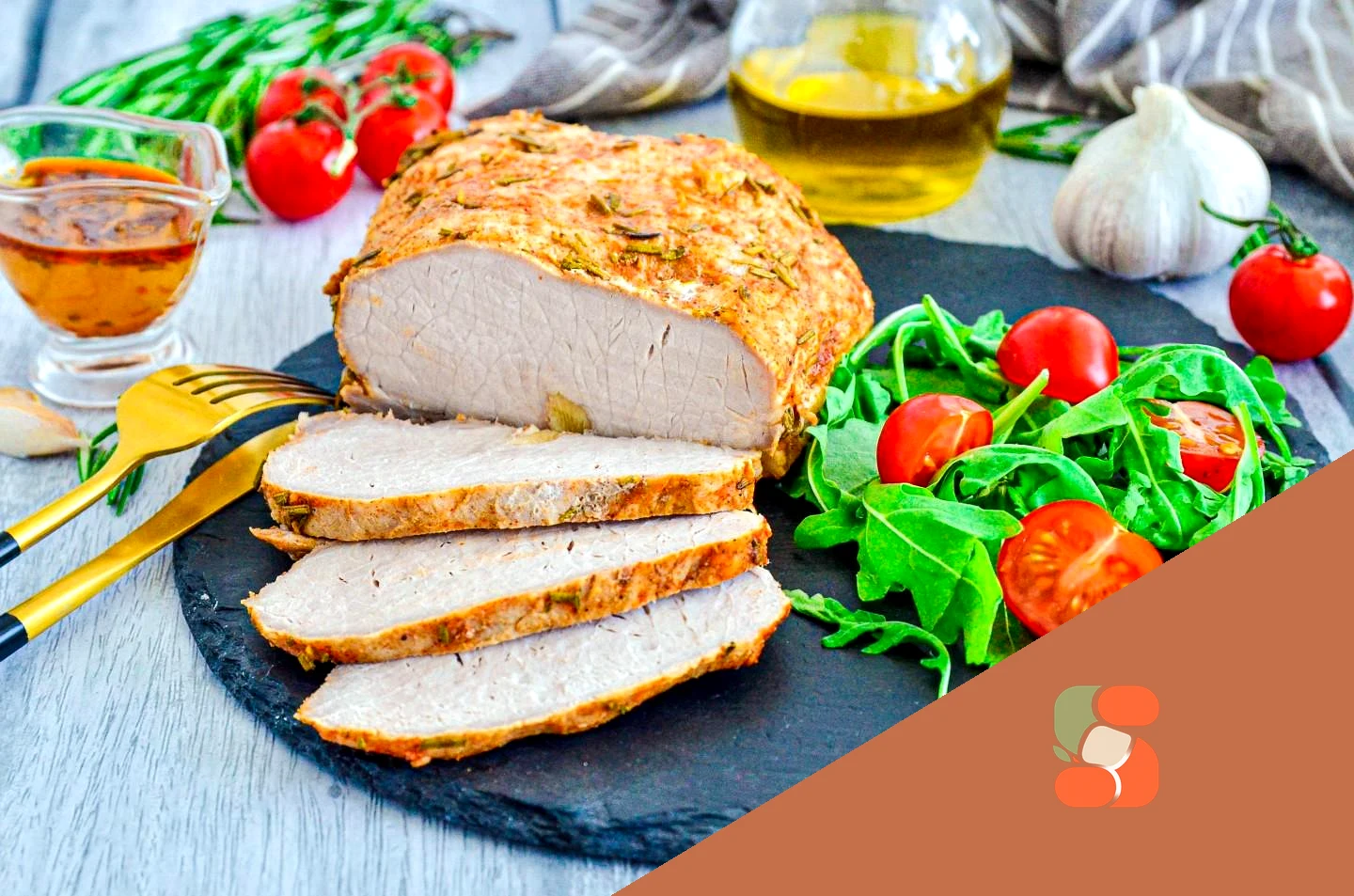 : М'ясо добре обмийте, а потім ретельно обсушіть паперовими рушниками. У мене охолоджений карбонад, якщо ви використовуєте заморожене м'ясо, то попередньо розморозьте його, скориставшись порадами, які написані в кінці рецепту. Я зрізала зайвий жир, але цього можна і не робити. Візьміть три щедрі щіпки солі і добре обмажте свинину з усіх боків. Зубчики часнику очистіть, потім розріжте кожен на 4 частини.