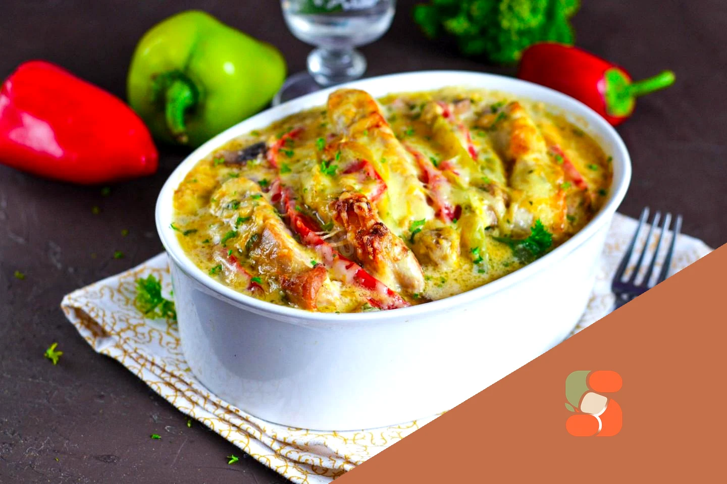 : Готову свинину з соусом, грибами та солодким перцем під сирною скоринкою подайте до столу. Приємного апетиту!