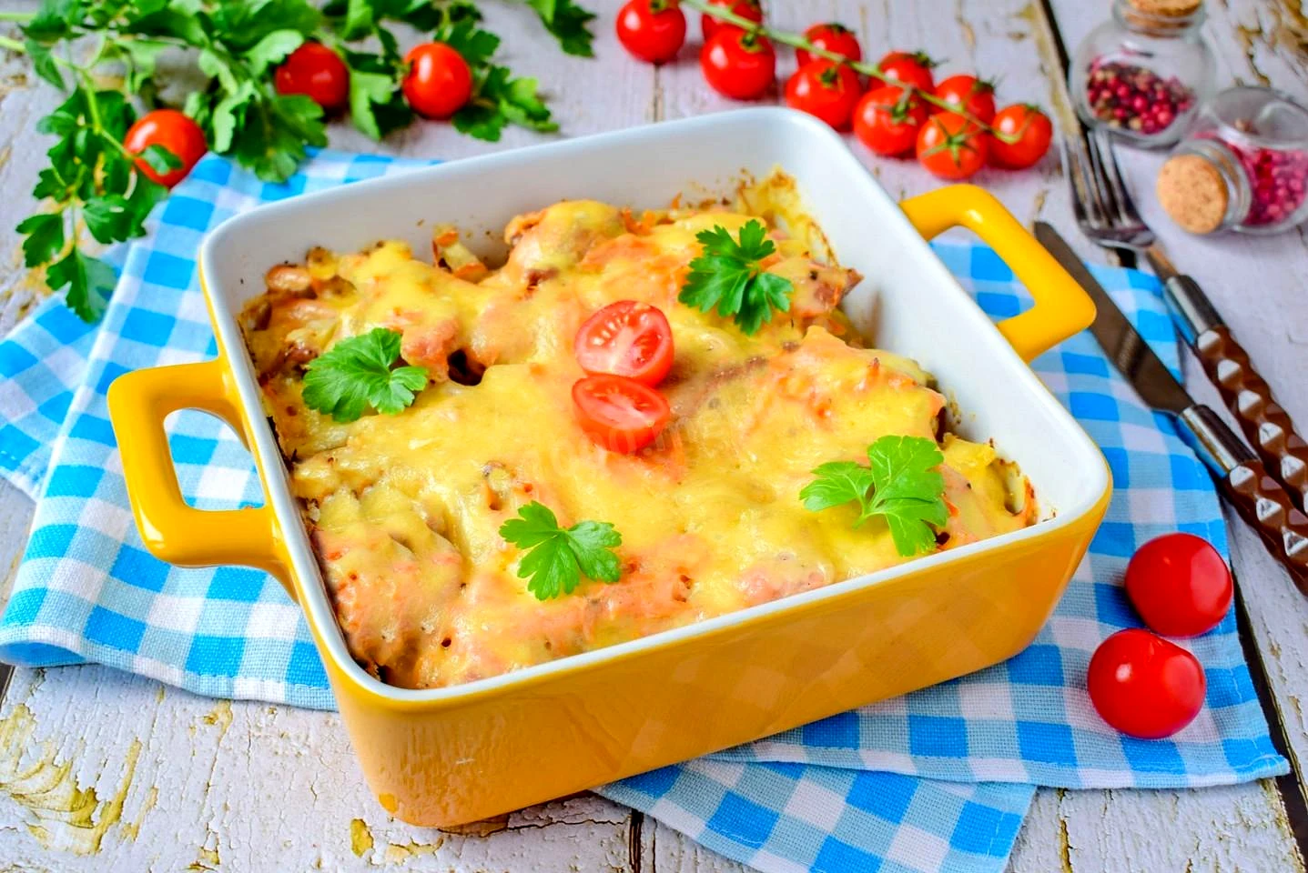 : Витягніть форму з духовки, посипте тертим сиром і поверніть назад в духовку ще хвилин на 10-15, щоб сир розплавився і трохи підрум'янився.
