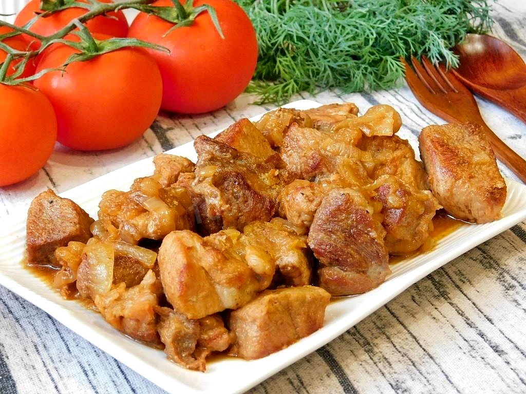 : Если мясо жестковато, то подлейте немного воды. Затем накройте крышкой и тушите на маленьком огне до готовности мяса. На это уйдет примерно минут 10-15. Если вы хотите, чтобы в готовом блюде была подлива, то используйте побольше воды. Готовое мясо прекрасно сочетается с любым гарниром. Приятного аппетита!