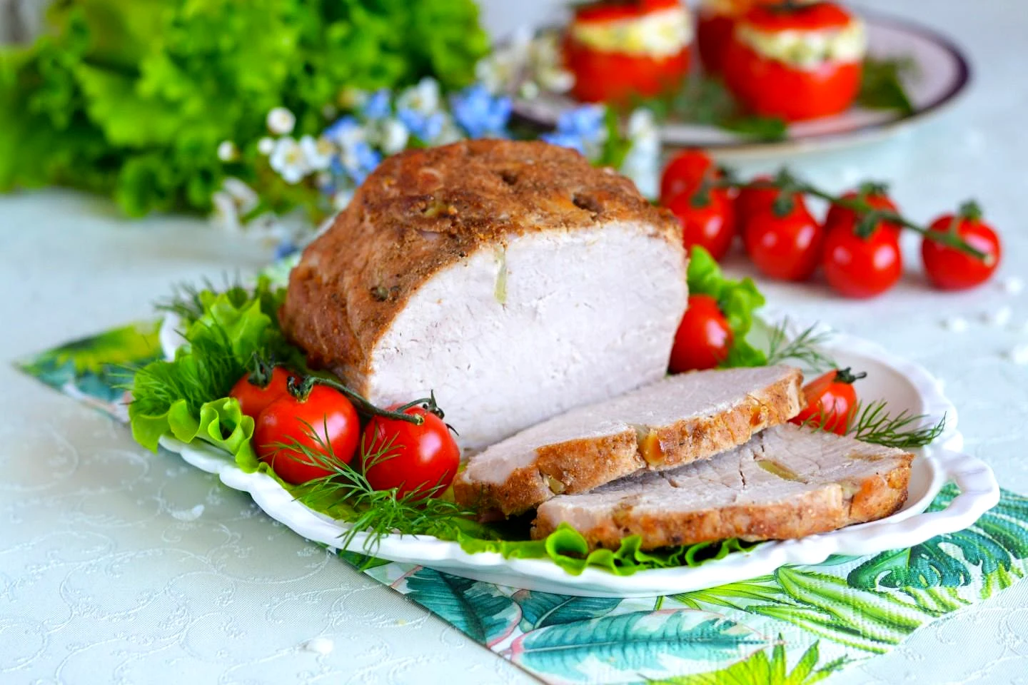 : Готове м'ясо перекладіть на блюдо, наріжте скибочками і подайте до столу, прикрасивши листям салату та помідорами чері. На наступний день у холодному вигляді свинина не менш смачна, її можна використовувати для бутербродів та сендвічів. Приємного апетиту!