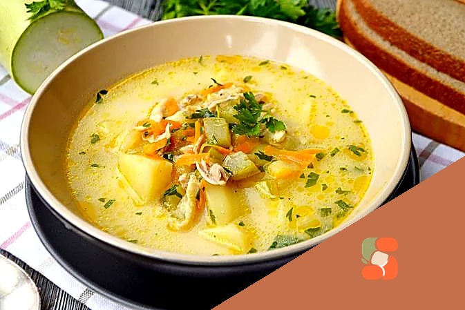 Ніжний крем-суп із золотистим відтінком, у якому плавають м'які шматочки курятини та легкі скибочки кабачків, створює ідеальний баланс овочевої свіжості та молочної кремистості. Сирна основа надає су…
