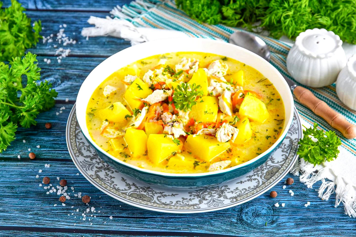 Как подготовить вкусный сырный суп к подаче? Уберите кастрюлю с огня, накройте крышкой и дайте супу настояться около 10 минут. Подавайте сырный суп в порционных тарелках, дополнив ароматными гренками, хлебом. Приятного аппетита!