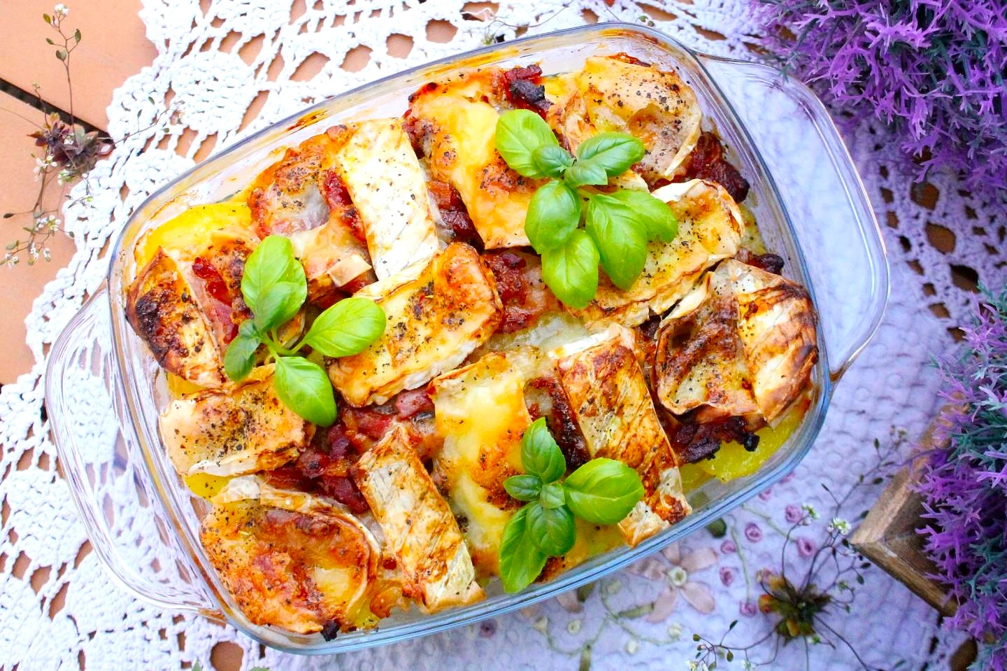 : Ориентируйтесь по образованию румяной и красивой корочки на сыре. Наше блюдо готово!. Подавайте тартифлет с беконом и сливками к столу!