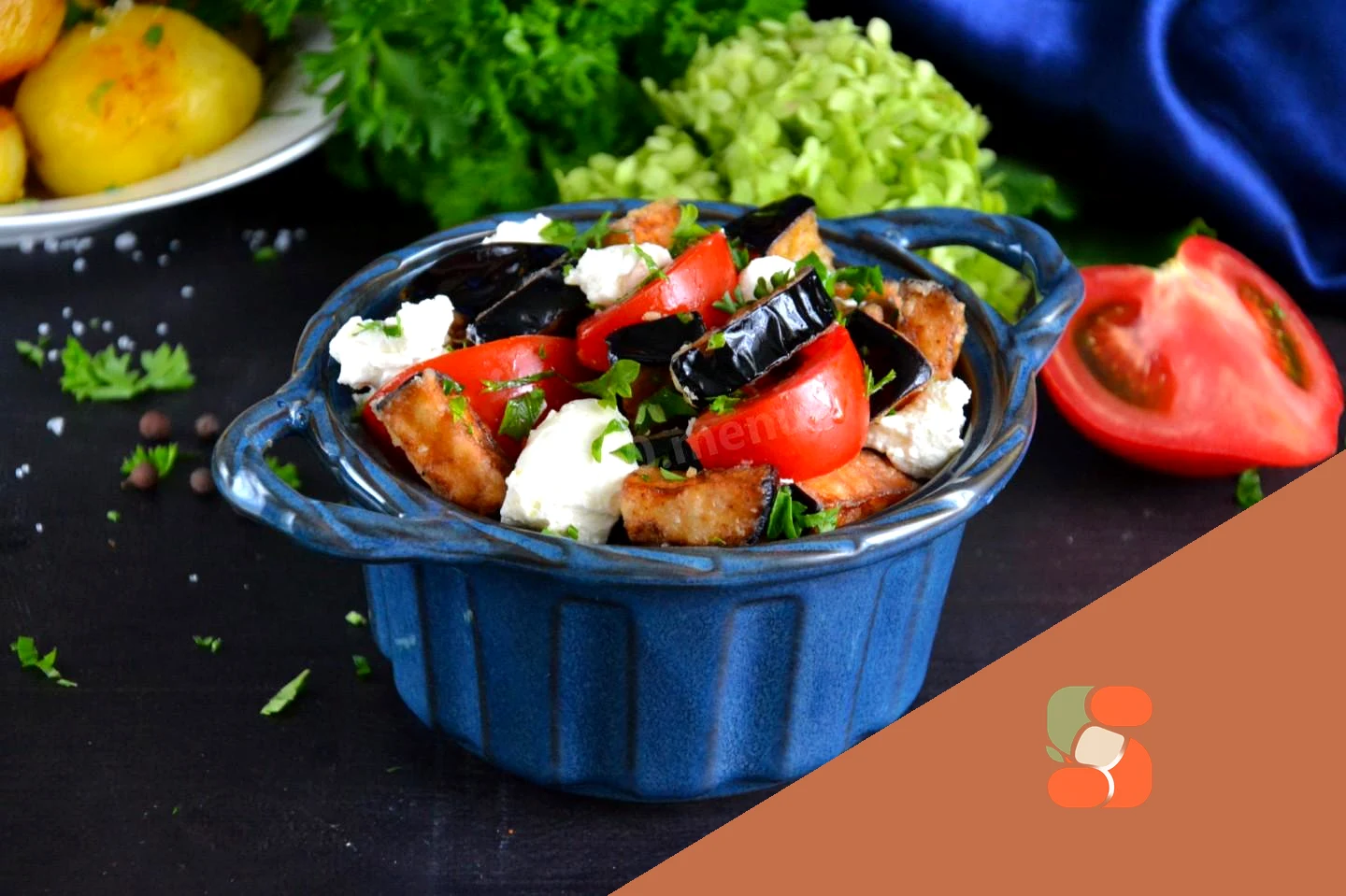 : Перекладіть салат на блюдо і ложкою викладіть зверху шматочки сиру сирного. Полийте салат заправкою та подайте до столу, поки баклажани ще теплі. Цей салат можна подавати і в холодному вигляді, але хвилин через 15 у міру остигання баклажани починають втрачати свою хрумкість і все більше розмокати. Тому раджу подавати салат одразу ж. Приємного апетиту!