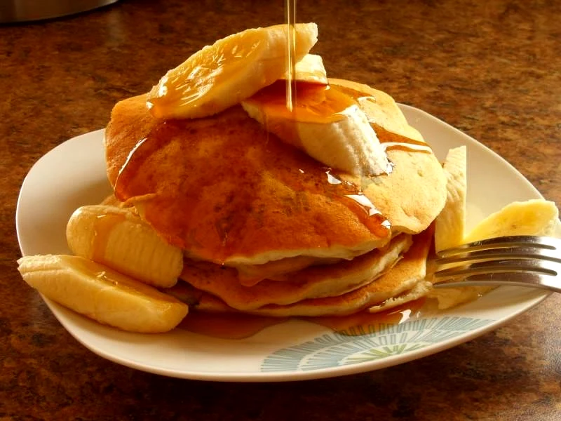 : Оскільки це американські панкейки, вони смажаться без додавання олії Подавати бананові панкейки можна з медом, розтопленим вершковим маслом, сметаною. Можна прикрасити страву шматочками стиглих бананів.