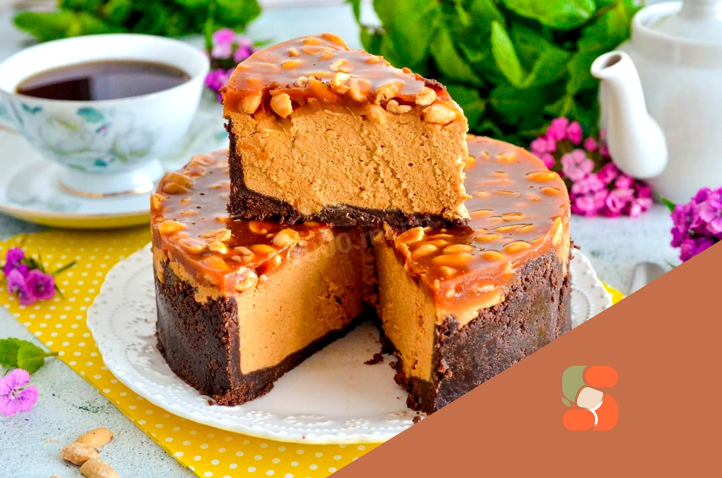 : Достаньте чизкейк из холодильника. Вылейте сверху карамель с орехами, разровняйте. Уберите в холодильник еще на пару часов.