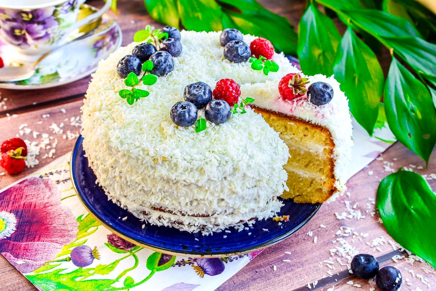: Обсипте торт кокосовою стружкою і залиште просочитися в теплі на 2 години, потім приберіть холодильник до подачі на стіл. Готовий тортик можете прикрасити на свій смак ягодами, фруктами, горішками і т.д. Приємного чаювання!