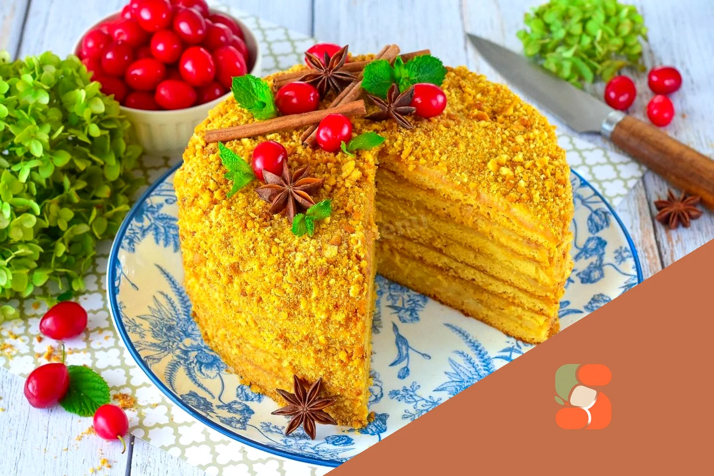 : Медовий торт наріжте на шматочки і подайте до столу Приємного апетиту!