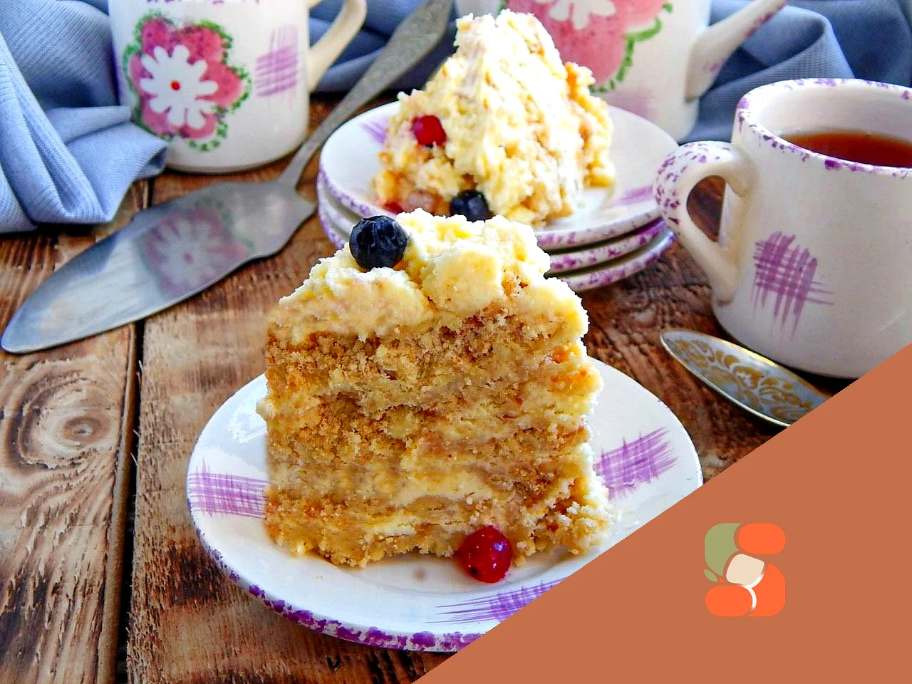 : Зверху викладіть пару столових ложок крему, акуратно розмажте його по поверхні коржа. Так зробите з усією пісочною крихтою і кремом.