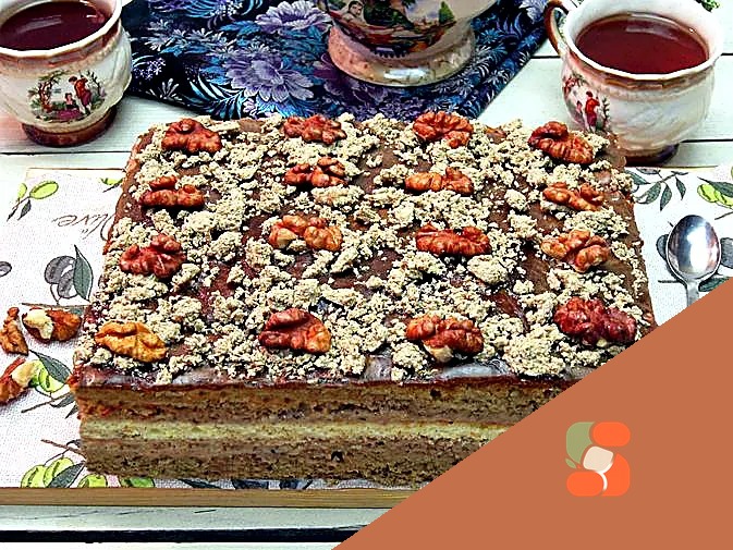 # Торт з халвою та ореховим кремом Розкішний торт, що поєднує ніжний, повітряний крем із хрусткою халвою та багатим смаком обліяних горіхів. Золотистий десерт із мармуровим рисунком і щедрою обсипкою…