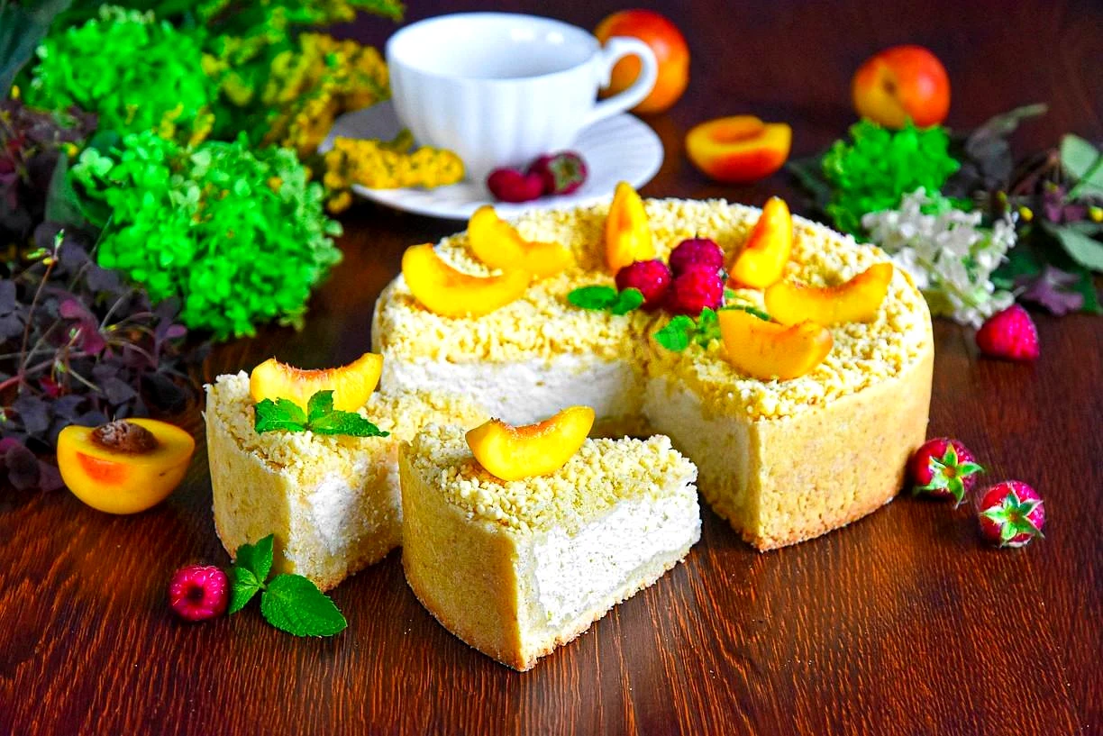 : Сверху посыпьте пирог оставшейся крошкой. Выпекайте ватрушку в предварительно разогретой до 170°С духовке около 45 минут. Начинка должна хорошо схватиться, а верх зарумяниться. Точное время зависит от вашей духовки.