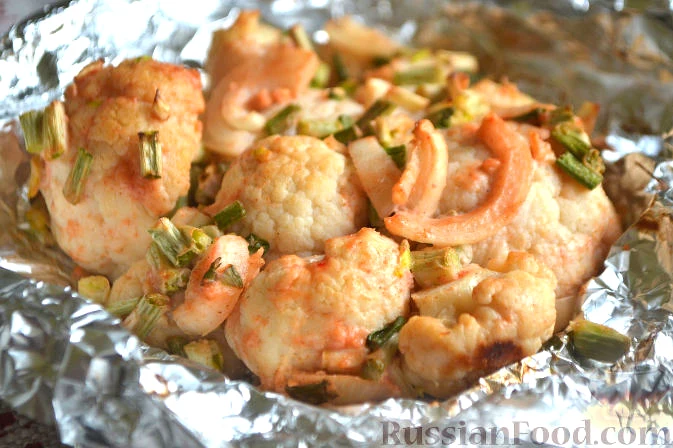 Беремо фольгу складаємо її вдвічі. На середину фольги викладаємо мариновану цвітну капусту з цибулею та черемшею. Закриваємо фольгу та ставимо блюдо в духовку. Готуємо 30 хвилин за температури 200 градусів.