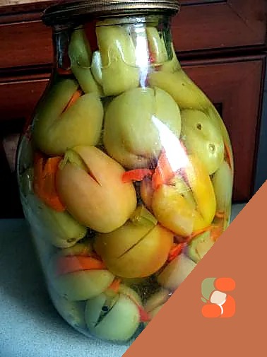 Втретє помідори залити маринадом. "Квіточки" із зелених помідорів закатати.