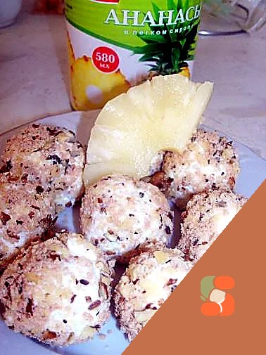Сир протираємо через сито, змішуємо з вершковим маслом та печивом. Катаємо з сирної маси маленькі кульки, в центр поміщаємо шматочок ананаса.