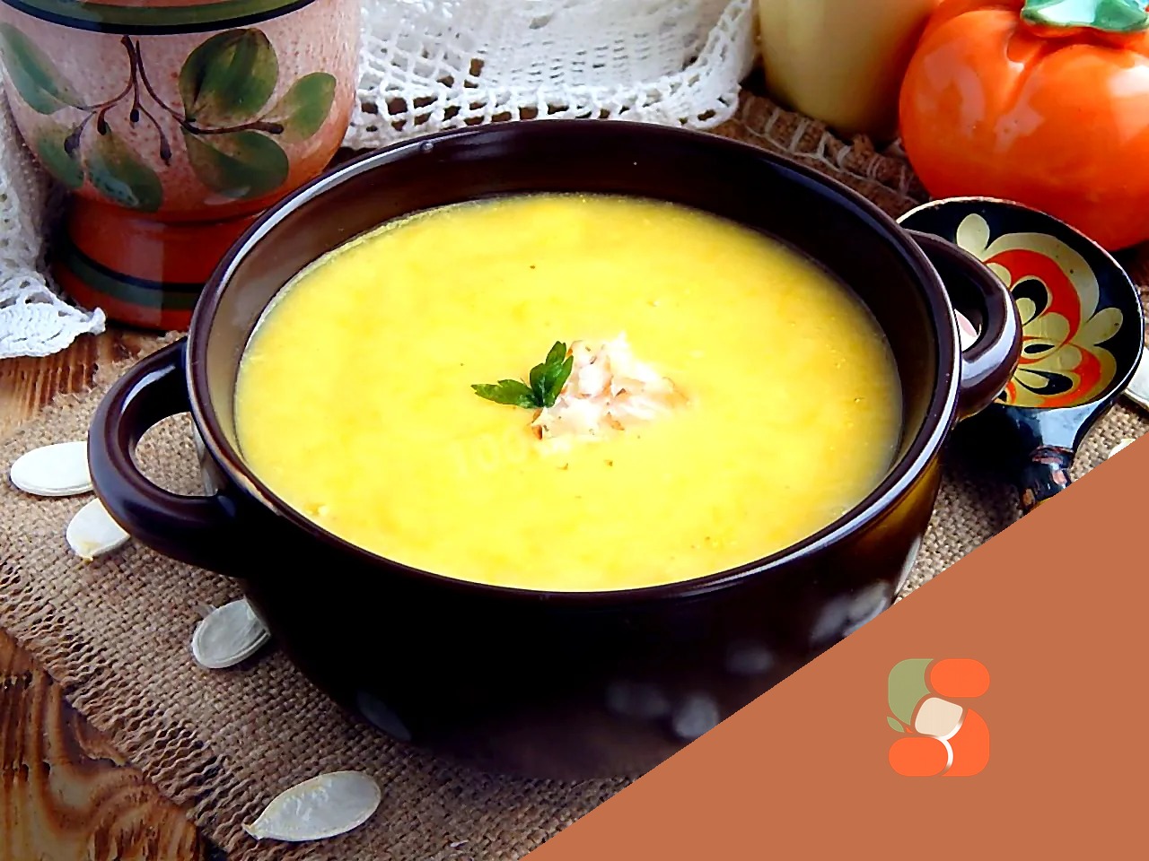: Варіть суп ще 5-7 хвилин Вимкніть вогонь, приберіть із бульйону лавровий лист та перець горошком. Пробийте суп занурювальним блендером до перетворення його на пюре. Дайте постояти трохи під кришкою і подавайте до столу. Щоб суп-пюре з гарбуза вийшов ще ніжнішим на смак, його можна заправити сметаною або вершками. Дуже смачний суп зі свіжою зеленню та грінками. Приємного апетиту!