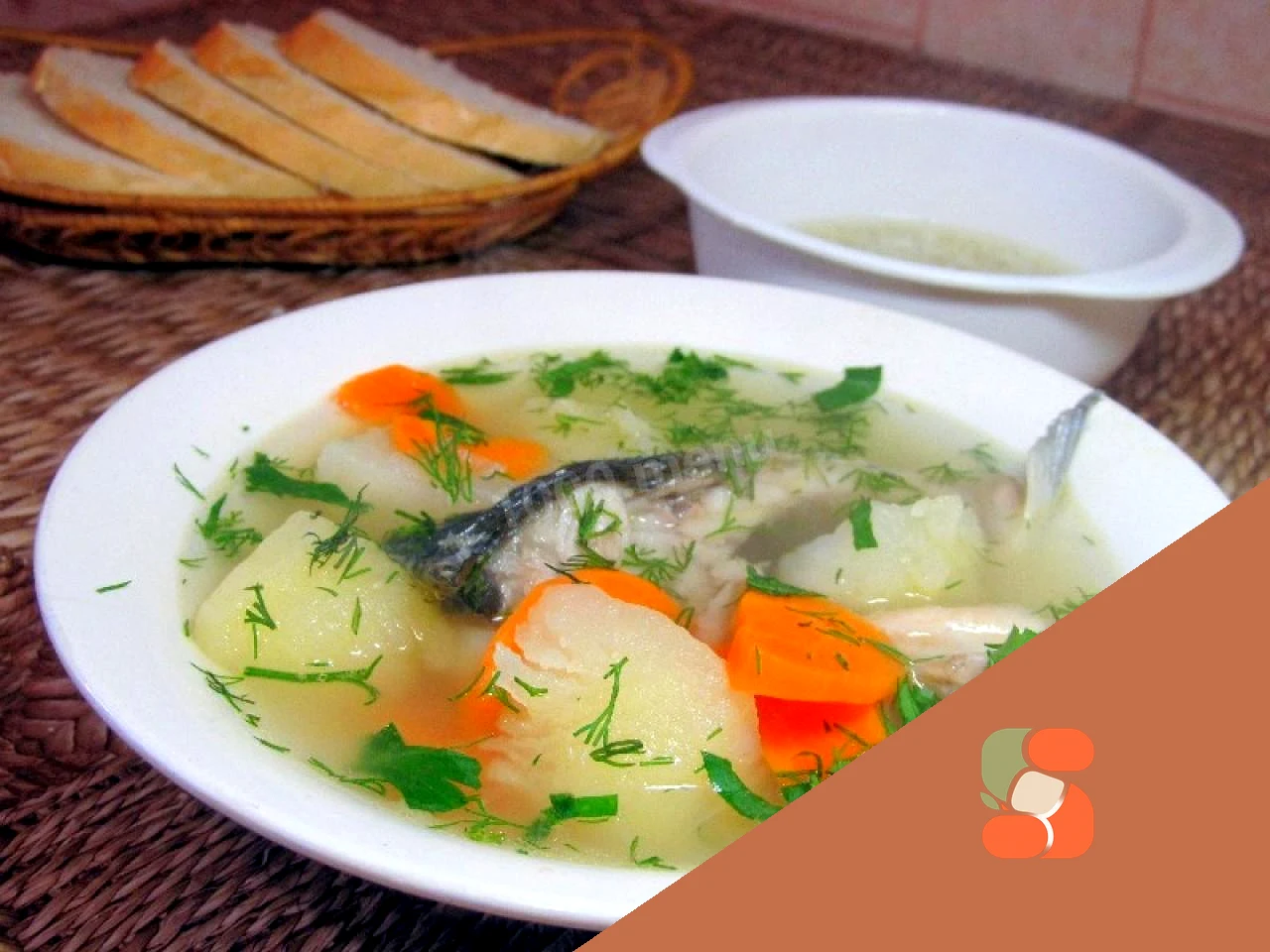 : І коли рибний бульйон закипить, закидаємо в каструлю картоплю, цибулю, моркву. Залишаємо варитися 15 хвилин. Коли овочі будуть практично готові, кладемо лавровий лист та перець горошком, залишаємо варитися ще 5 хвилин, щоб спеції розпустили свій аромат. : Тепер додаємо шматочки сирого коропа Зменшуємо вогонь до мінімуму так, щоб рідина злегка побулькувала. Варимо ще 30 хвилин
