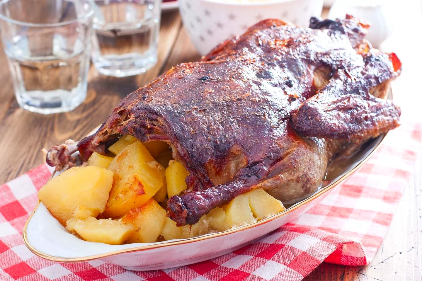 : Как запечь утку в рукаве с картошкой фаршированную? Подготовьте указанные продукты. Утку лучше брать свежую, ранее не замороженную. Из специй можно взять любые по своему вкусу. Также можно приготовить маринад для утки, какой больше по вкусу. Чем больше вес утки, тем больше потребуется картофеля и времени на приготовление. Картофель старайтесь выбирать не крахмалистых сортов. Подготовьте глубокую посуду, форму для запекания и рукав.