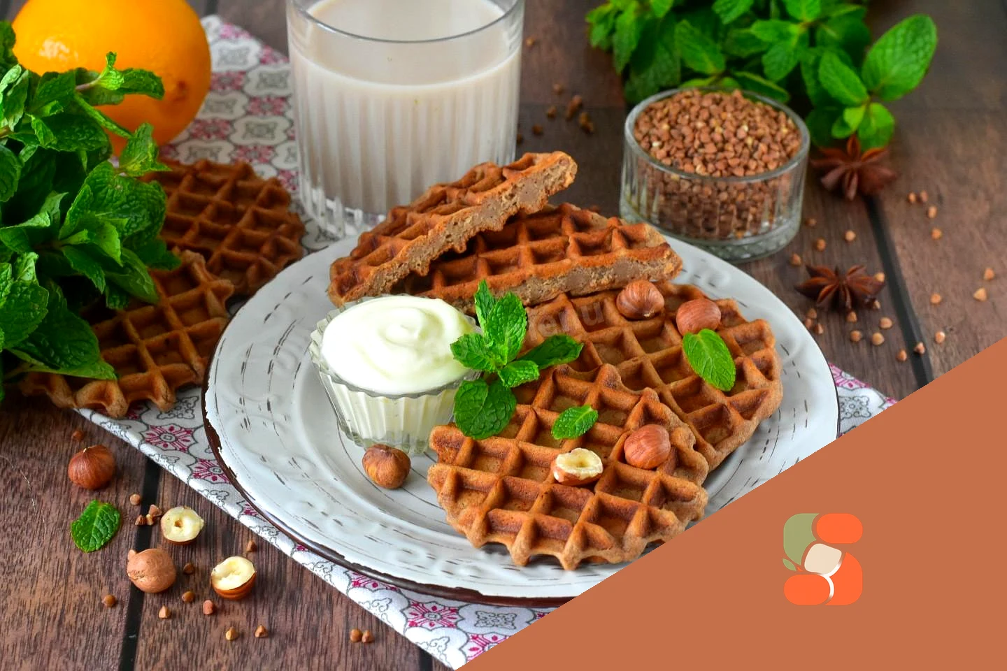 : Гречані вафлі перекладіть на тарілку, посипте горіхами і прикрасьте м'ятою За бажанням доповніть йогуртом або топінгом та подайте до столу. Приємного апетиту!