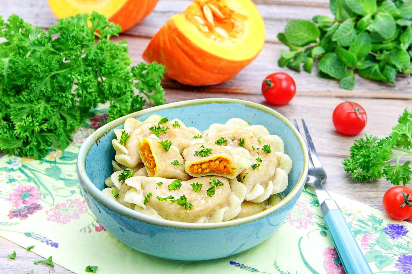 : За допомогою шумівки вийміть пельмені на тарілку. За бажанням їх можна полити невеликою кількістю оливкової олії або будь-якого рослинного. Посипте пісні вареники з гарбуза ароматною дрібно нарізаною зеленню і подавайте до столу. Приємного апетиту!
