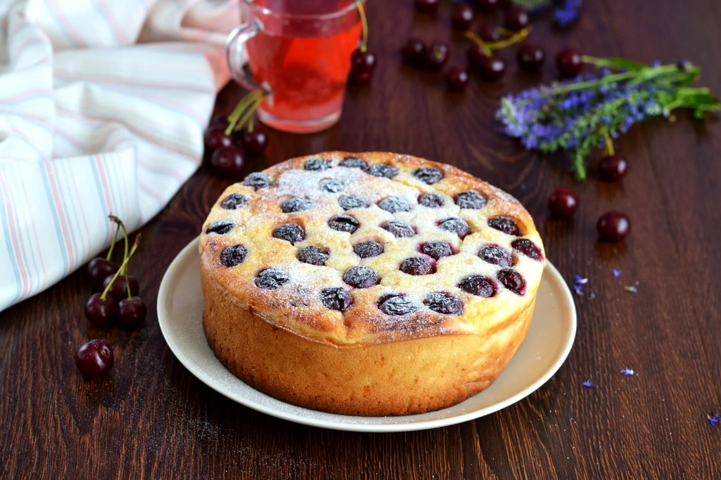 : На творог разложите ягоды вишни. Ягоды нужно выкладывать только на творожную начинку, не нужно затрагивать тесто и сминать слои. Поставьте форму с ватрушкой в разогретую до 180°С духовку на 40-45 минут.