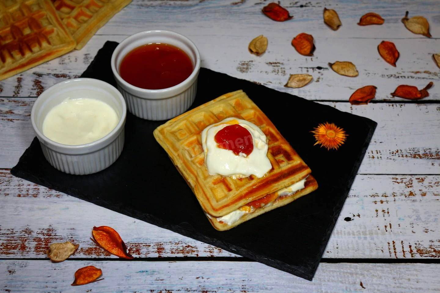 : Беремо 1 вафлю і викладаємо на неї начинку, а саме 1 столову ложку сметани та 1 чайну ложку варення. Потім встановлюємо 2 вафлі поверх начинки. Цю процедуру проробляємо з вафлями, що залишилися.