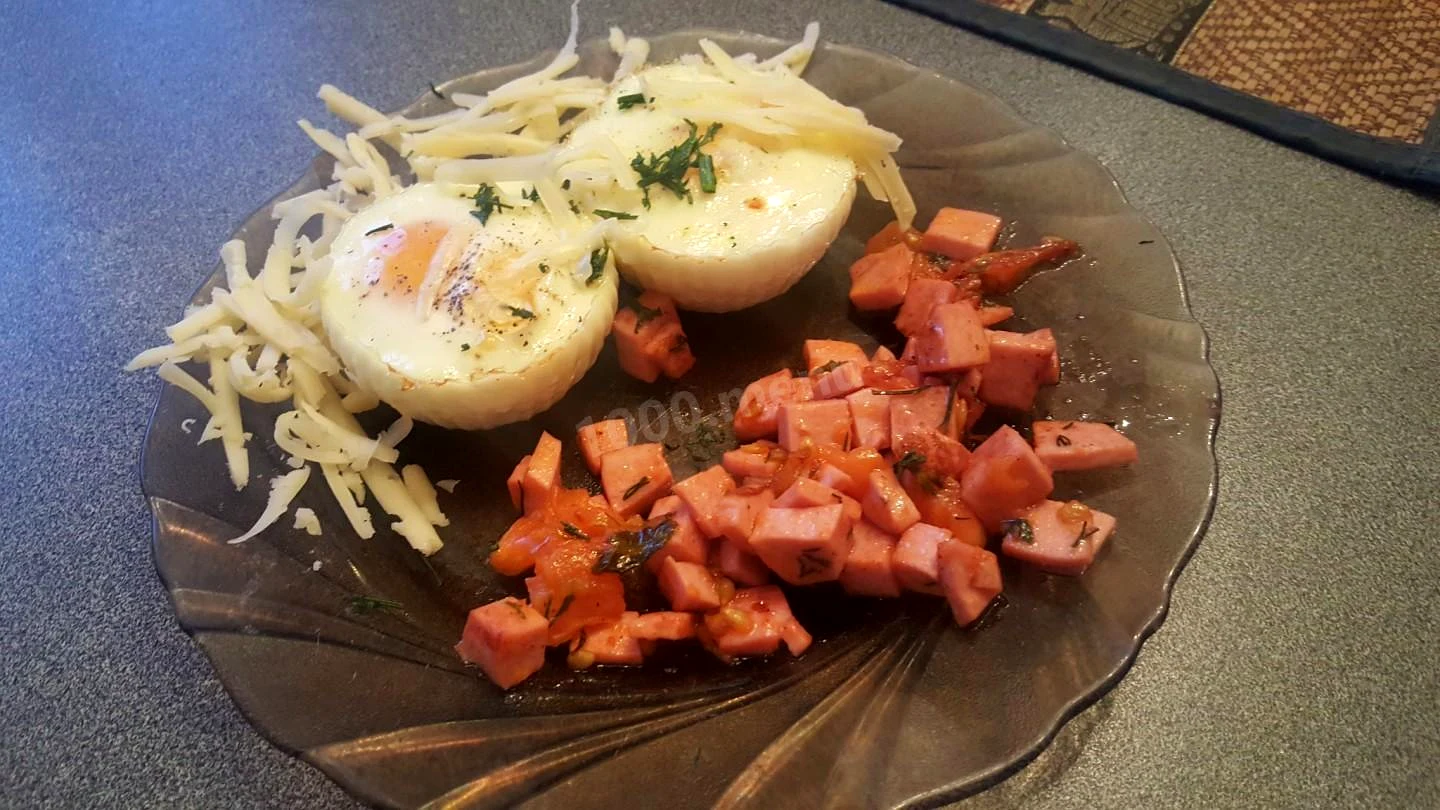 Інгредієнти−2 порції+Продукти (2 порції)Яйця2 шт.Варена ковбаса100 грПомідори1 шт.Спеції сухі10 грЗелень10 грСир будь50 гр