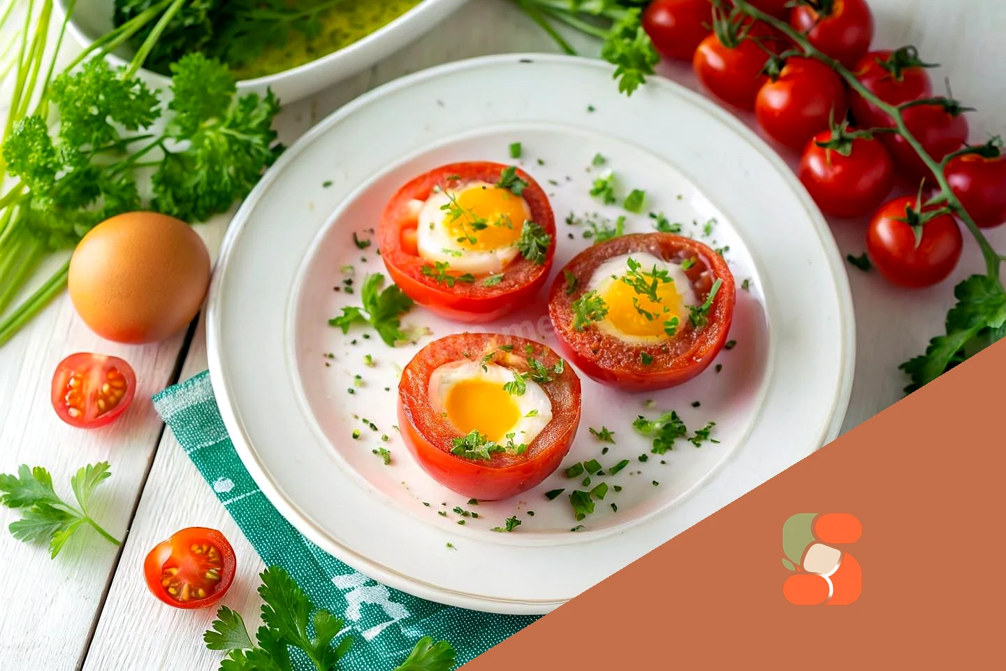 : Всередину кожного помідора розбийте по яйцю, посоліть, покладіть спеції на смак.