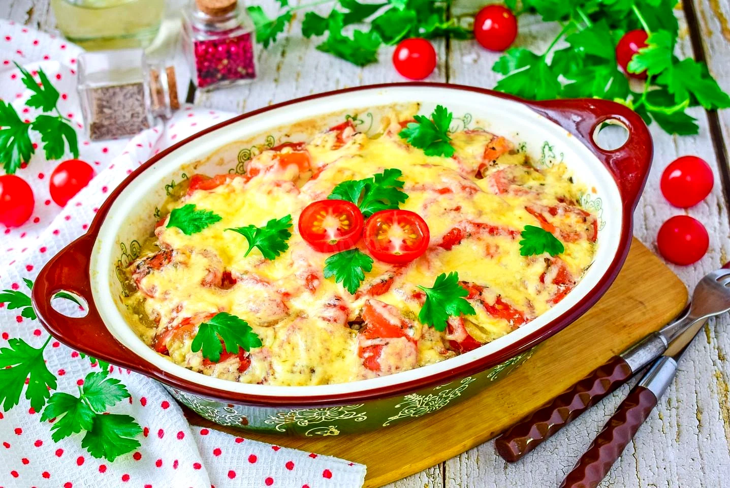 : Зверху розкладіть нарізані помідори Накрийте форму фольгою і поставте в духовку, розігріту попередньо до 190 градусів, на 40-50 хвилин. Час і температура вказані приблизно, орієнтуйтеся на особливості роботи духовки. Докладніше про це можна прочитати у статті, посилання на неї ви знайдете наприкінці цього рецепту.