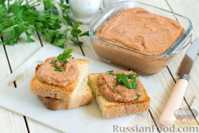 Подавайте закуску на скибочки свіжого або підсмаженого хліба, прикрасивши зеленню. Можна використовувати як начинку для тарталеток. Смачного!