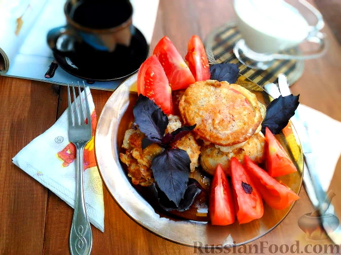 Для приготування закуски капрезе в клярі вам знадобляться помідори, моцарелла, базилік червоний, молоко, яйце, борошно, оливкова олія, сіль і перець.