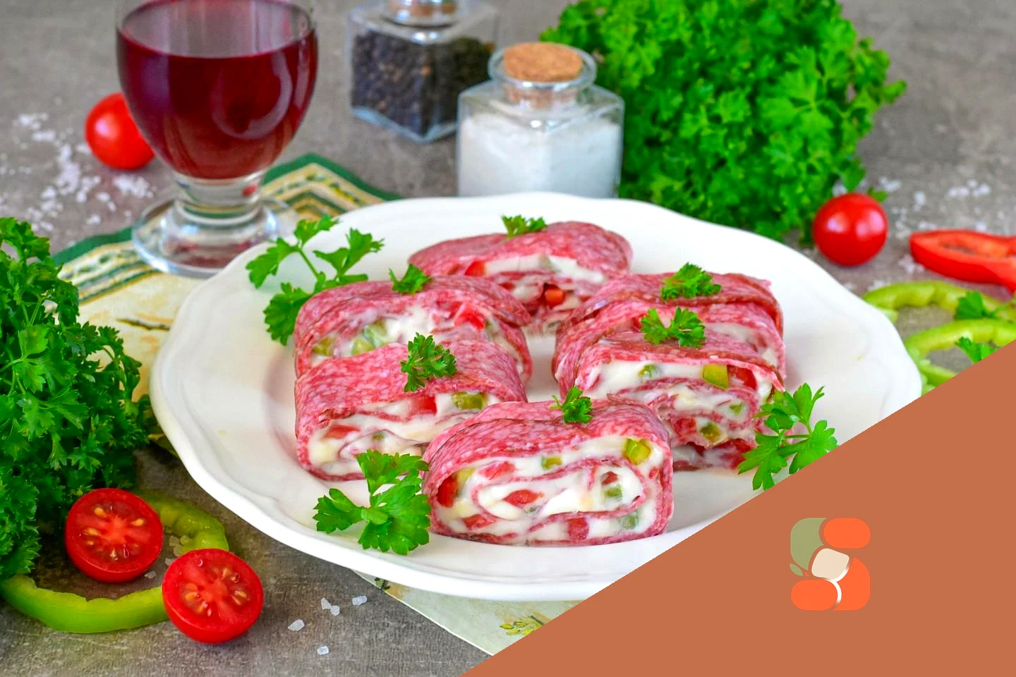 : Ковбасу краще беріть вже в нарізці або попросіть нарізати її спеціальним приладом у магазині - так скибочки вийдуть тонкими і легко згортатимуться. Якщо такої можливості немає, наріжте ковбасу самі так тонко і рівно, як зможете. Важливий нюанс - ковбасу краще беріть діаметром більше - великі кружечки краще згорнуться в рулет і щільніше прилягатимуть один до одного.