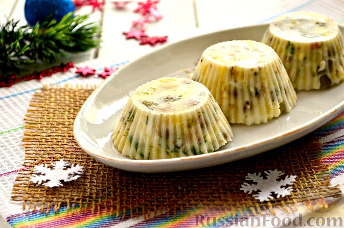 За допомогою столової ложки заливаємо салат олів'є зі шпротами желатином із майонезом. Забираємо формочки із заливним олів'єм у холодильник на 1-2 години (до повного застигання).