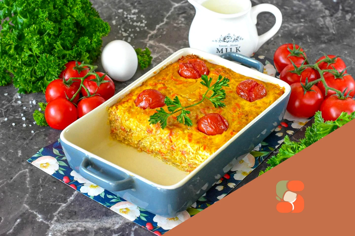 Як зібрати запіканку і запекти до рум'яної скоринки? Перекладіть все у форму для запікання та розрівняйте. Зверху розкладіть цілі помідори чері. Поставте форму попередньо розігріту до 200℃ духовку приблизно на 30 хвилин. Як зрозуміти, що запіканка вже готова? Поверхня запіканки має зарум'янитися. Докладніше про те, як правильно підібрати форму для випікання, а також час і температуру випікання у духовці, читайте у статтях. Посилання знаходяться наприкінці рецепту.