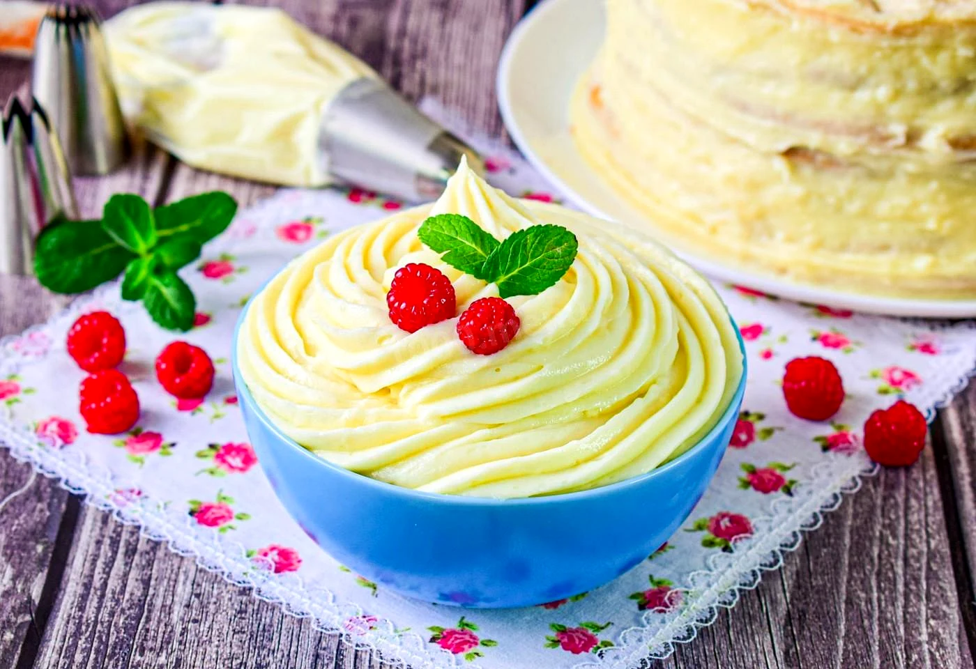 : Класичним заварним кремом прошаруєте коржі для наполеону. Я збираю торт, коли ще крем теплий, але не гарячий. Теплим кремом коржі швидше просочаться. Цієї кількості крему мені вистачило, щоб промазати 8 коржів по 18 см у діаметрі, трохи зверху та з боків. Зібраний торт я тримаю за кімнатної температури 3-4 години, а потім прибираю в холодильник у коробці і залишаю на добу.