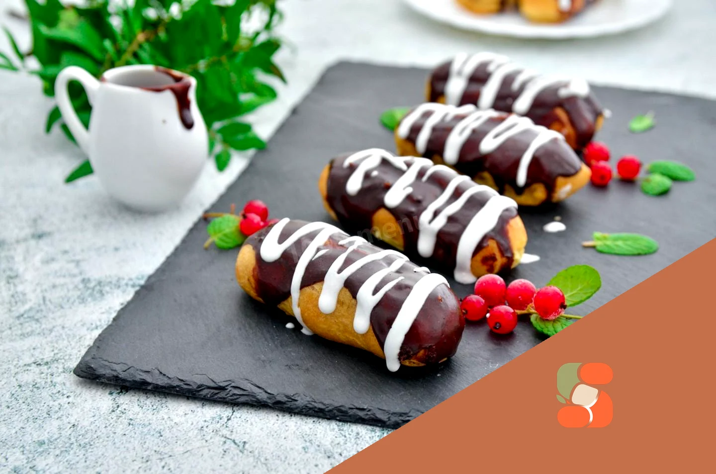 : Готовое пирожное можете украсить по своему вкусу. Я покрыла их шоколадной глазурью. Из данного количества продуктов у меня получилось 30 небольших эклеров.