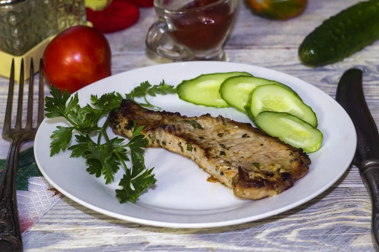 Жареная свиная корейка на кости на сковороде