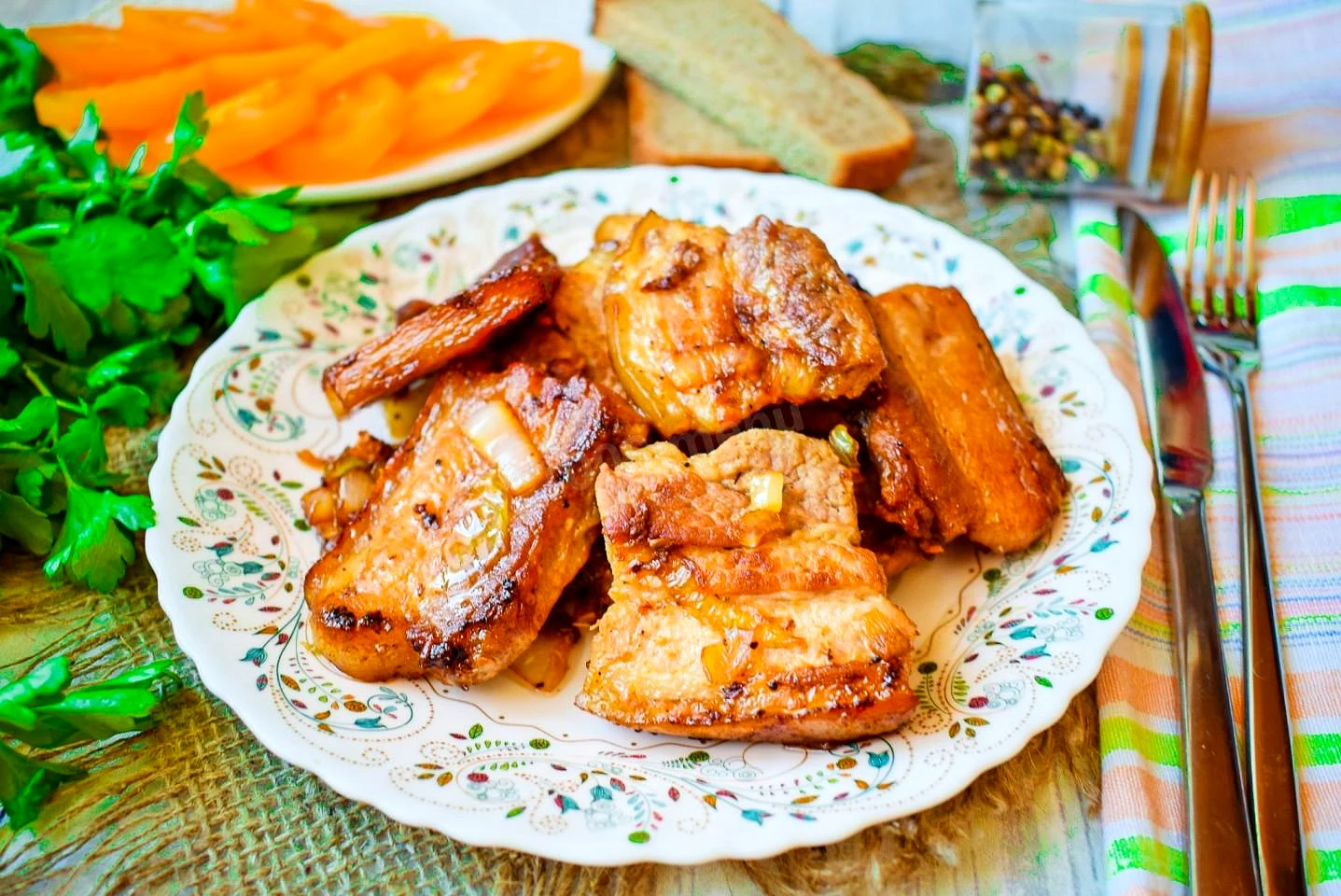 : Готовое жареное сало с луком разложите по тарелкам и подавайте к столу в горячем виде. На гарнир отлично подойдут блюда из картофеля, например, картофельное пюре. Также сало можно пожарить на мангале. Приятного аппетита!